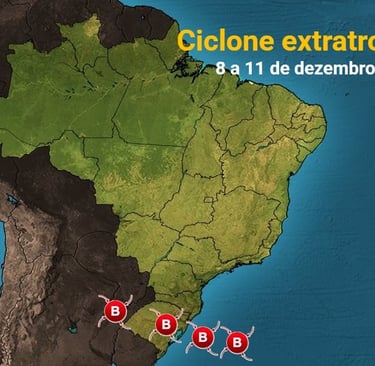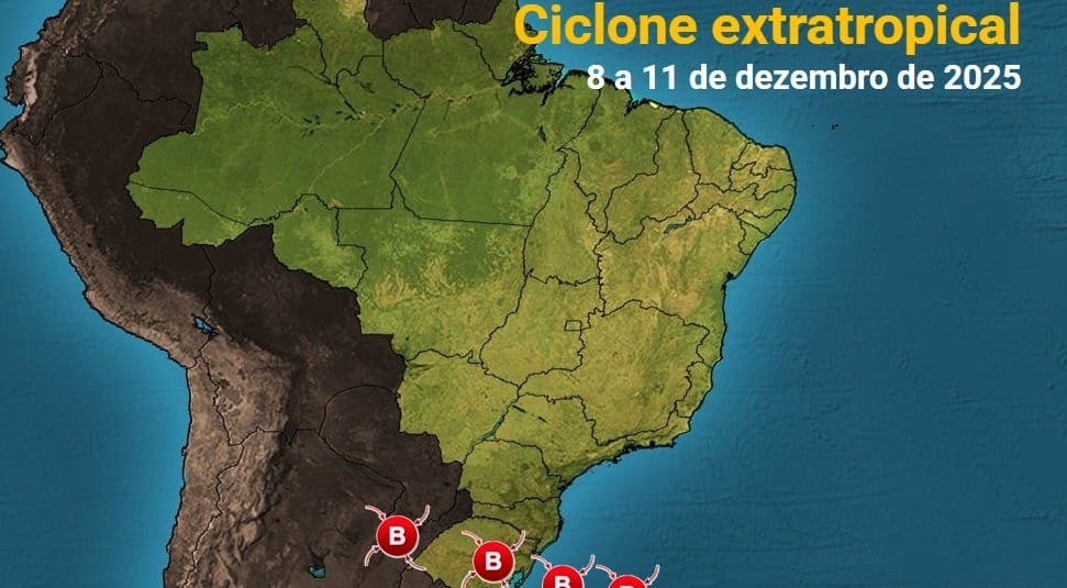 A formação de um novo ciclone extratropical, acompanhada de uma frente fria, coloca regiões do Sul, Sudeste e Centro-Oeste do Brasil em estado de atenção entre os dias 8 e 11 de dezembro. O sistema deve provocar chuva forte, muitos raios e rajadas de vento que podem superar 100 km/h, especialmente no Rio Grande do Sul e em Santa Catarina.