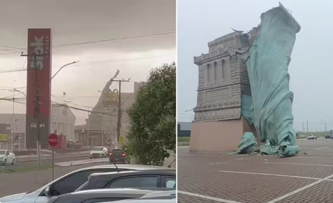 Uma estátua que replica a Estátua da Liberdade, localizada em frente à loja da Havan em Guaíba, na Região Metropolitana de Porto Alegre, desabou na tarde desta segunda-feira (15) durante um forte temporal que atingiu o Rio Grande do Sul.