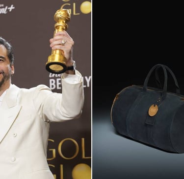 Os itens são acomodados em uma bolsa especial criada pela marca Atlas Bespoke, confeccionada em camurça natural, com acabamento sofisticado, ferragens em tom dourado e uma etiqueta exclusiva do Globo de Ouro.